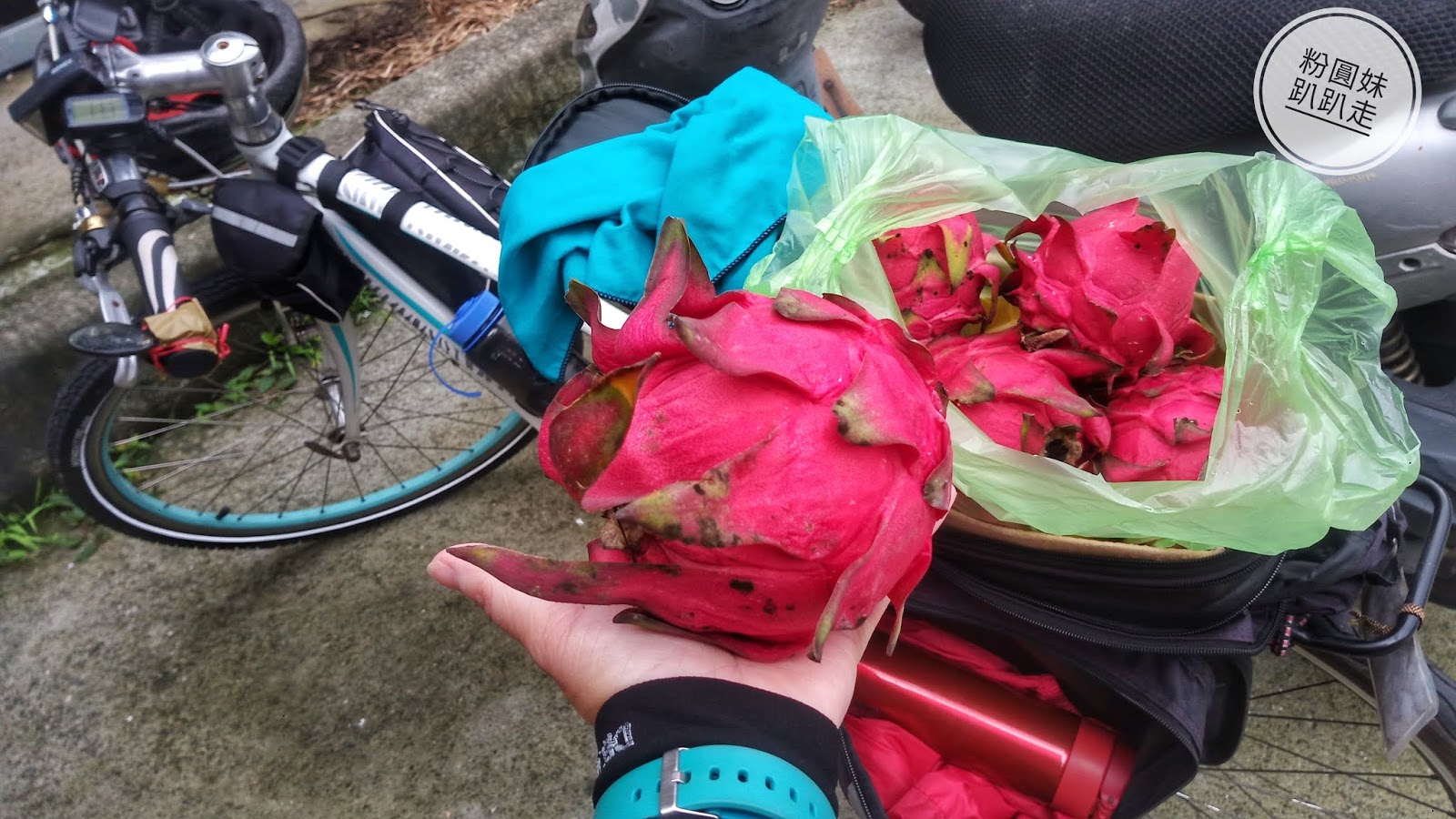 我中午只帶一罐八寶粥在山上吃,下山再買菜回青旅煮,登山口水果攤時令水果都超便宜,每盤水果100元,現在有木瓜、芒果、火龍果等,這麼大顆火龍果5顆100元一定要買呀,差點塞爆我的環島兼菜籃車。登山兼買菜,住青旅的生活,跟以前一樣沒什麼改變,冰箱夠大又空,很可以。